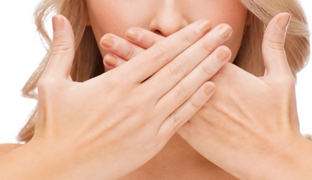 손을별려-입냅새를-맡는-여성입을-두손으로-가린-여성