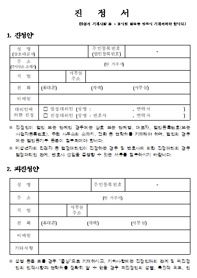 실제 진정서 양식은 특별하게 정해진 것이 없기 때문에 위의 내용이 있는 진정서 양식으로 온라인 배포 버전으로 받아 이용해도 된다. 또한 진정서 양식에서 필요한 사항들이 있는 진정서 작성요령은 아래와 같이 형성되어 있다.