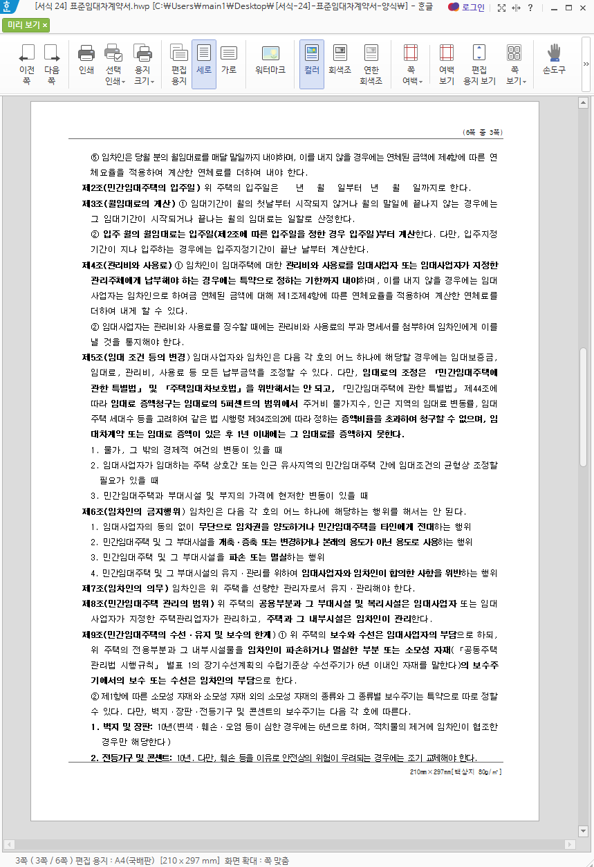 위에서 이야기 했듯 첨부된 임대차계약서는 총 6쪽 분량의 표준임대차계약서 무료 양식이며, 한글 hwp 파일로 제공을 하니 필요한 분들은 다운로드하여서 이용해 보시기 바랍니다.